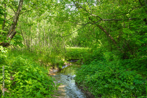 Naklejka premium Classic summer woodland landscape with creek, fresh grass and trees