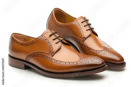 © Tamim, Fototapeta premium Classic tan leather wingtip brogues with intricate perforation and black laces