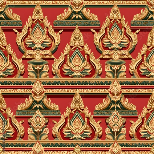 © JHONDOMINIC, Fototapeta premium Classic Thai Temple Details in Vibrant Reds and Golds with Architectural Symmetry, Seamless Pattern