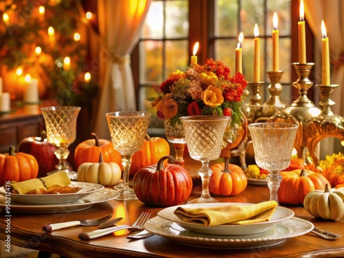 Naklejka premium Classic traditional Thanksgiving holiday dinner table set festive fall decor fine china crystal glassware formal elegant sophisticated atmosphere refined luxury warm festive ambiance