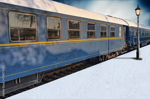 Fototapeta premium Classic train on snowy platform with lantern in winter
