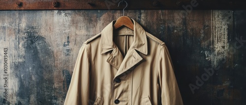Fototapeta premium Classic trench coat on sturdy wooden hanger