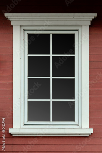 © Okta, Fototapeta premium Classic white framed window on red horizontal wooden plank wall texture background for architectural design.