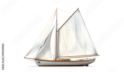 © Mahmud, Obraz premium Classic Wooden Sailboat with White Sails Isolated on a White Background design