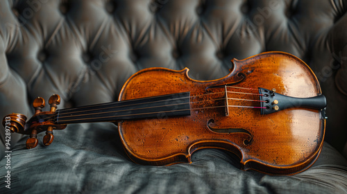 © Narsha, Fototapeta premium Classic wooden violin set against a dark, textured fabric, giving a refined and elegant impression, Generative AI