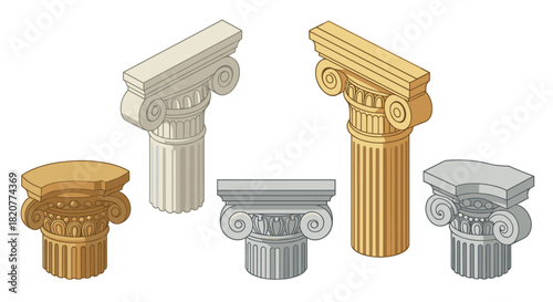Naklejka premium Classical architecture capitals in isometric style - doric, ionic, corinthian designs