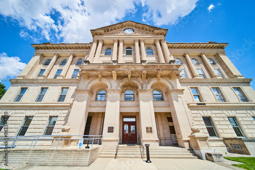 © Nicholas J. Klein, Obraz premium Classical Courthouse with Columns Under Clear Blue Sky Low Angle