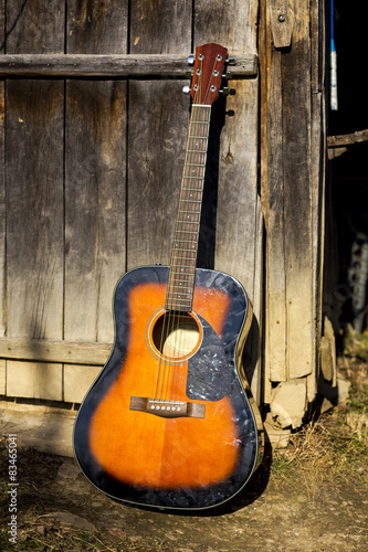 © jinga80, Fototapeta premium Classical guitar leaning against wooden door