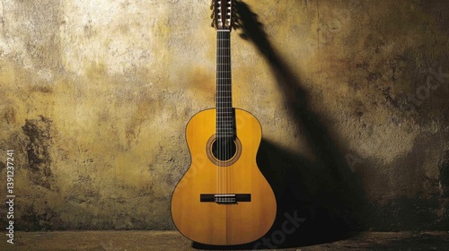 Obraz premium Classical Guitar Standing Against a Textured Wall Casting Dramatic Shadow