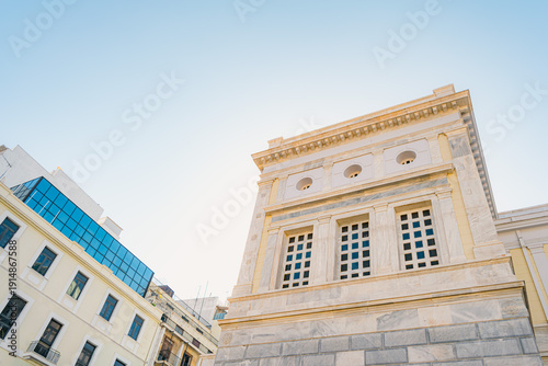 © One, Fototapeta premium Classical Limestone Building Meets Modern Glass Facade, Low Angle