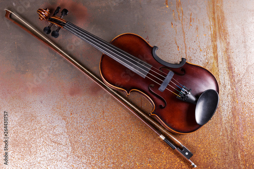 © kelifamily, Fototapeta premium Classical violin on rusty background. Studio shot of old violin. Classical musical instrument