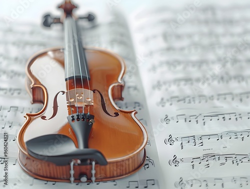 © Bussakon, Fototapeta premium Classical Violin Resting on a Sheet of Music with Floating Notes in the Background