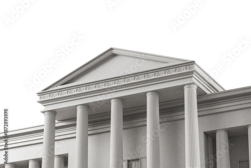 © ImageFlow, Naklejka premium Classical white building facade with decorative pediment and Corinthian columns, isolated on white background. 3D Rendering. 3D Rendering