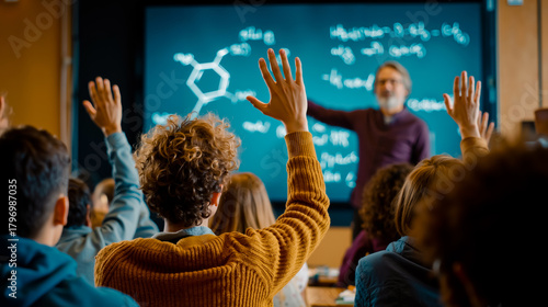 © Nikname, Naklejka premium Classroom education teacher students learning hands up question interactive teaching chalkboard science chemistry molecular structure molecule class lecture engagement