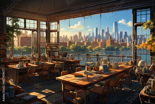 © JM Nimhas, Naklejka premium classroom scene of children setting up tables