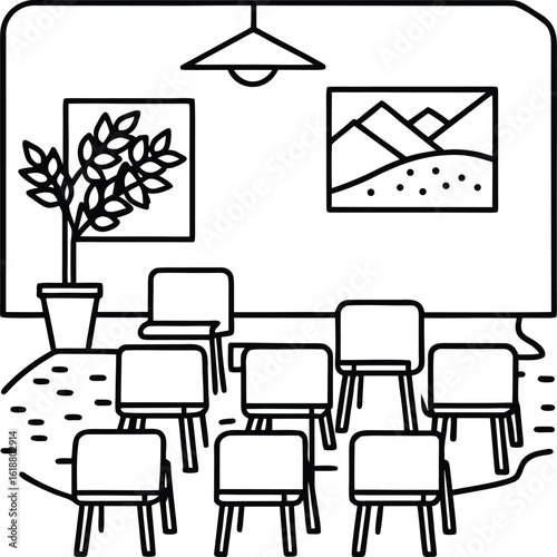 © HMDHasan, Fototapeta premium classroom with colorful chairs map and plants