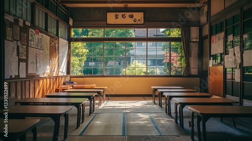© Mrs. Studio, Obraz premium Classroom with Empty Desks Interior Featuring Natural Light and Japanese Style
