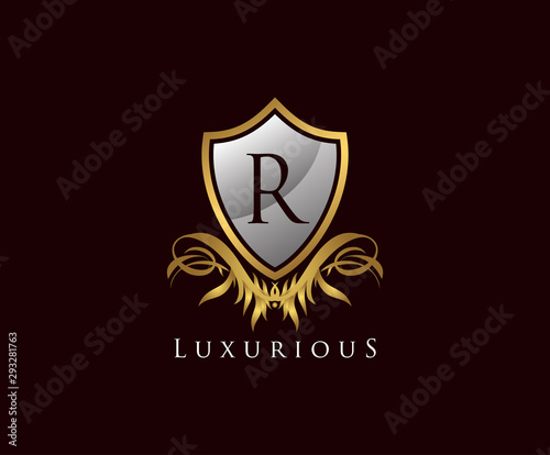 Obraz premium Classy Shield R Letter Logo. Gold Vintage Shield With R Letter prefect for boutique, hotel, restaurant, wedding and other elegant business.