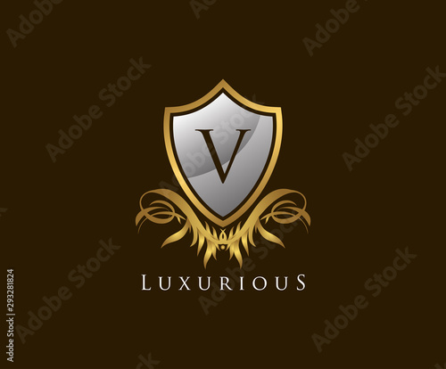 Obraz premium Classy Shield V Letter Logo. Gold Vintage Shield With V Letter prefect for boutique, hotel, restaurant, wedding and other elegant business.