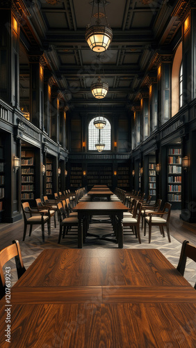 Fototapeta premium Classy wooden tables and chairs arranged in a library reading area, literature, books