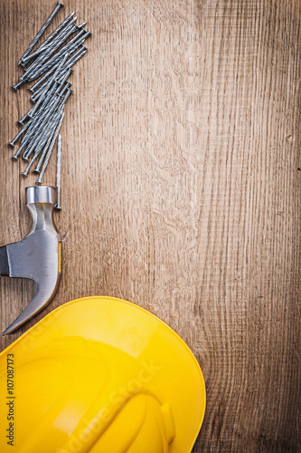Fototapeta premium Claw hammer metal construction nails building helmet on wooden b