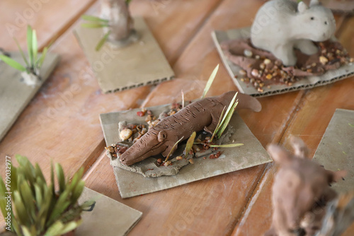 © Acento Creativo, Obraz premium Clay crocodile sculpture made by children in ceramics class. Ceramic animal crafts made by hand in art class for children.