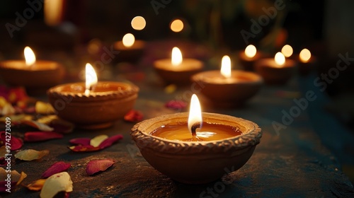 © shooreeq, Obraz premium Clay Diya lamps Happy Diwali, festive atmosphere, place for text