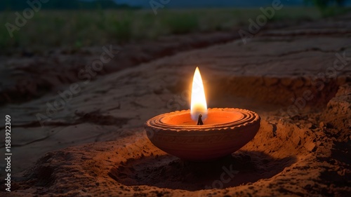 Obraz premium Clay diya (oil lamp) glowing on the edge of a mud wall at dusk — minimal, spiritual, and culturally symbolic 3