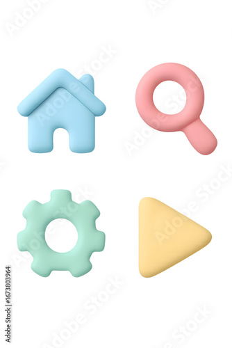 © Muzy Studio, Fototapeta premium Clay pastel UI icons set isolated on transparent background home search settings and play button soft 3D style for app and web design