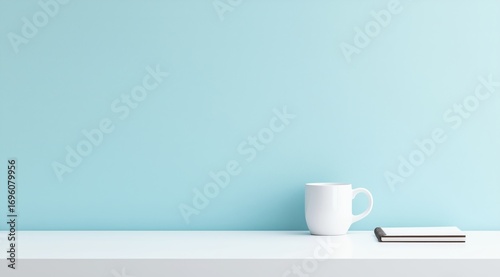 © olegganko, Obraz premium Clean and Simple Workspace With a White Mug and a Notebook on a Pastel Blue Background.