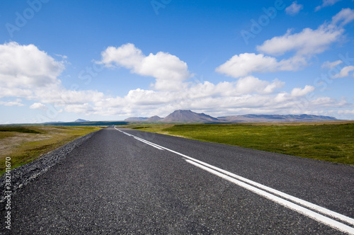 © Anna, Naklejka premium Clean asphalt road in island towards horizon with blue sky