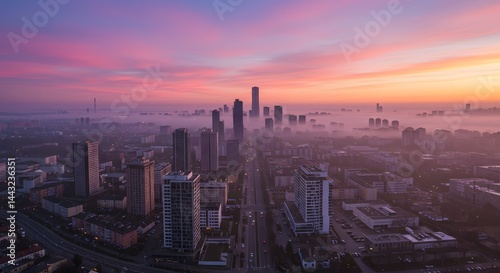 © ImageThink, Fototapeta premium Clean city skyline with no air pollution at sunrise