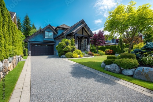 © Maryna, Fototapeta premium Clean Driveway. Expensive Luxury Home with Blue Garage in Suburbs of Vancouver, Canada