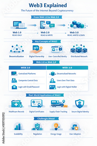 © Muhammad Aamir , Obraz premium Clean educational infographic explaining Web3, internet evolution, decentralization, digital ownership, real-world use cases, and challenges.
