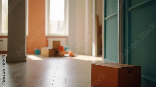 © vlntn, Fototapeta premium Clean empty room with stack of cardboard boxes, moving into a new house concept. Indoor empty interior background. AI generative image.