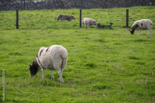 Obraz premium Clean fur woolen sheep in open farm or zoo. Warm sunny day. Funny animal on green grass.