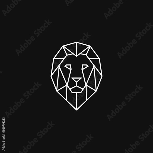 © Katy, Fototapeta premium Clean geometric lion head created with sharp white vector lines on a deep black background. The symmetrical polygonal structure gives the design a modern, bold, and iconic appearance. Ideal for logos,