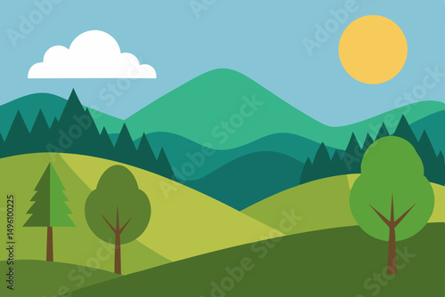 © Radha Rani, Obraz premium Clean Minimal Nature Landscape with Rolling Hills and Trees Wallpaper Vector Illustration Background