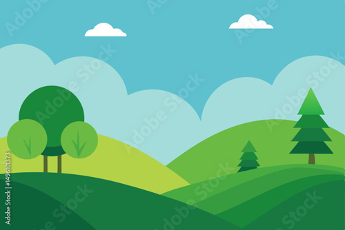 © Radha Rani, Obraz premium Clean Minimal Nature Landscape with Rolling Hills and Trees Wallpaper Vector Illustration Background