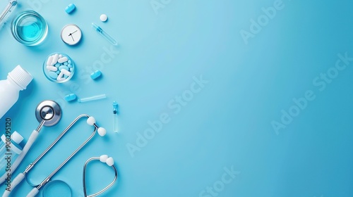 Obraz premium Clean Minimalist Blue Background with Medical Icons for Headlines and Text Space