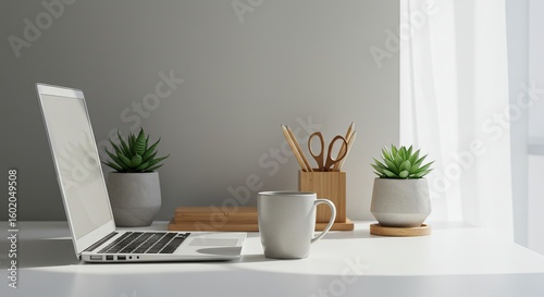Obraz premium Clean minimalist desk with white laptop, ceramic coffee mug, small succulent plant, wooden desk organizer, natural lighting, Scandinavian design aesthetic, work from home concept, commercial lifestyle