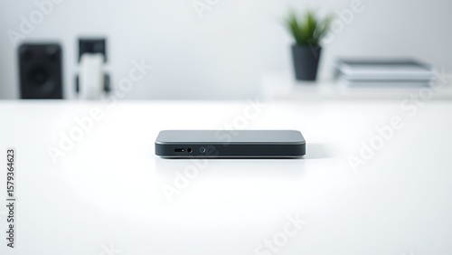 Fototapeta premium Clean minimalist workspace featuring a closed device on a white surface with...