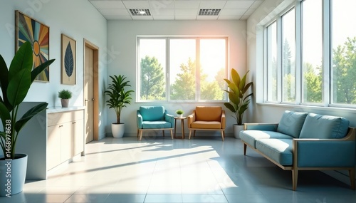 Fototapeta premium Clean, modern doctor's office waiting area with comfortable seating and natural light , interior, medicine