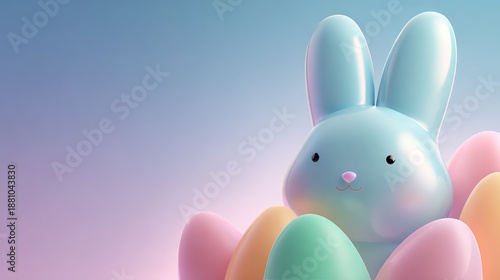 Fototapeta premium Clean, Modern Inflatable 3D Easter Banner With A Glossy Bunny For Spring Celebration, Family Fun, Easter Sunday Decor, And Colorful Painted Eggs