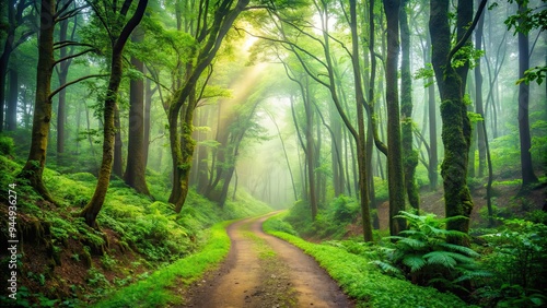 © Jotch, Fototapeta premium Clean path winding through lush green forest with misty atmosphere, clean, green, path, moist, forest, nature, environment