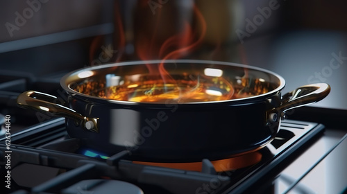 © hassanmim2021, Fototapeta premium Clean saucepan on a gas stove in kitchen. Generative Ai