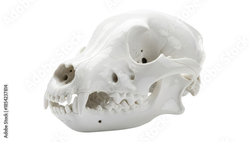Obraz premium Clean white canine skull with visible sutures and sharp teeth, meticulously...