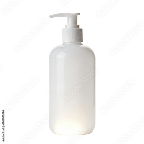 © Jiranath, Fototapeta premium Clean white dispenser bottle for soap or lotion. Blank plastic mockup container simple transparency background