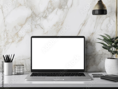 © Olya Ivanova, Fototapeta premium clean, white, free laptop monitor, with free space for text, on a desk on a light colored background with a houseplant on the desk, photo. Presentation, advertisement, contacts, template