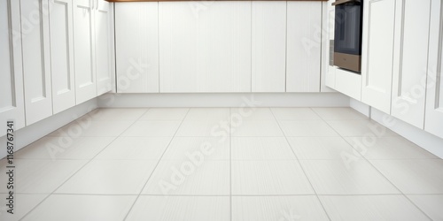 Fototapeta premium Clean white kitchen floor tiles beneath white cabinetry